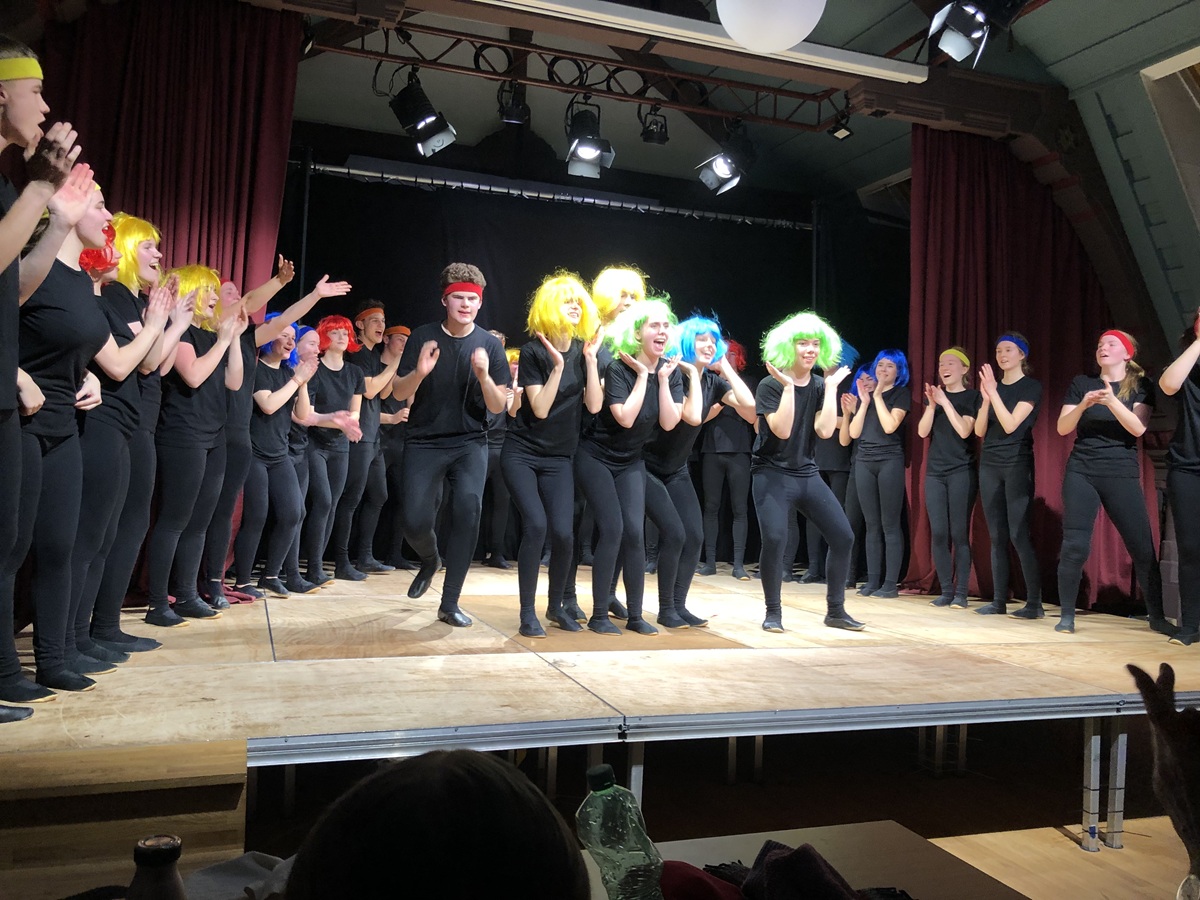 Unter der Leitung von Herrn Böckelmann inszenierten die 35 Schülerinnen und Schüler die Verwechslungskomödie in Doppel-, Trippel- oder auch Quattro-Besetzungen. Alle ganz in schwarz gekleidet, konnte man relevante Darstellerinnen und Darsteller an farbigen Perücken bzw. Stirnbändern erkennen.