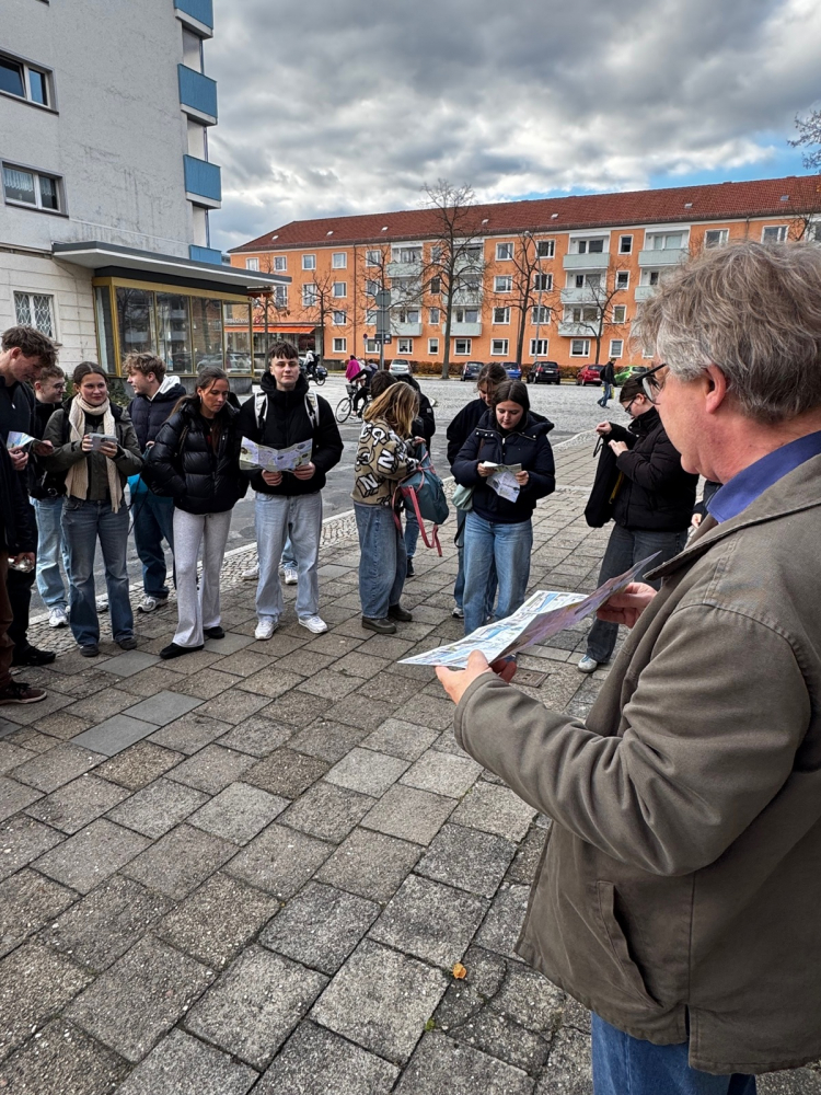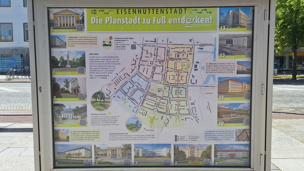Herr Kühler führte die beiden Gruppen nacheinander schließlich auf einem von der Tourismusinformation der Stadt empfohlenen Rundgang durch die Wohnkomplexe I - III, die zusammen ein großes Flächendenkmal bilden.