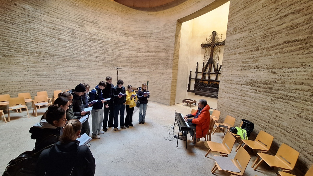 Der Politik-Leistungskurs des 11. Jahrgangs von Herrn Kühler fuhr mit dem Fahrrad von der Bösebrücke bis zum Brandenburger Tor ein Stück des ehemaligen Mauerstreifens entlang. An ausgewählten Stationen berichtete der Lehrer über den Aufbau der Grenzanlagen, die Mauertoten, die Mauerschützenprozesse, über Fluchtversuche und die Konzeption der Erinnerungskultur in Berlin (9. November 1989). Ein besonderes Highlight war der Besuch in der Kapelle der Versöhnung, wo uns Herr Kanert, der sich dort regelmäßig freitags ehrenamtlich engagiert, schon erwartete und einiges zur Versöhnungskirche und ihrer Geschichte erklärte. Anschließend sangen wir gemeinsam die Hymne: We shall overcome.