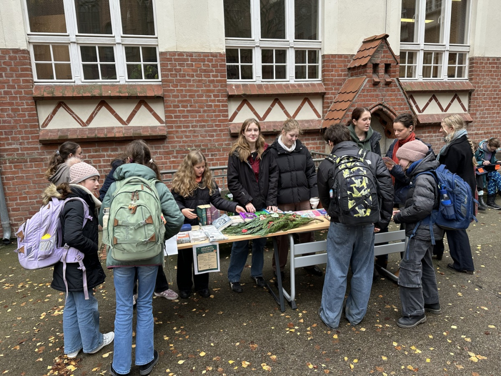 In der vergangenen Woche veranstaltete die Klima-AG von Mittwoch bis Freitag erstmals einen Adventsbasar auf dem Hof und in der Schulbibliothek. Bei warmem Punsch und vorweihnachtlicher Stimmung konnten Schülerinnen und Schüler gut erhaltene Bücher, Spiele und kleine Geschenke miteinander tauschen.