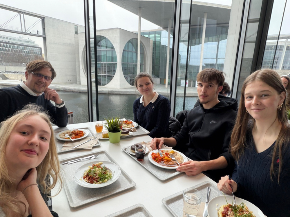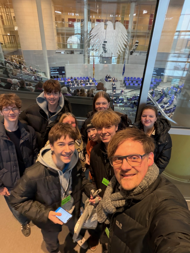 Der Politik-LK der 11. Klasse von Herrn Zaake besuchte am 28. Januar auf Einladung der Bundestagsabgeordneten Julia Schneider (Grüne) den Bundestag. Der Tag begann im Plenarsaal mit der Regierungserklärung von Friedrich Merz, bei der zahlreiche bekannte Abgeordnete verschiedener Parteien anwesend waren und debattierten. Anschließend führten wir ein Gespräch mit Julia Schneider zu ihrer Arbeit im Bundestag und ihrer Rolle als Wahlkreisabgeordnete. Den Tag krönte ein gemeinsames Mittagsessen in der Bundestagskantine. Es war ein spannender Tag im Zentrum der Macht inklusive Selfie mit dem Vizekanzler.