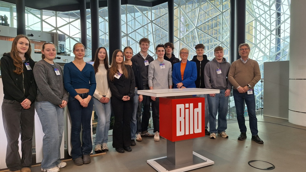Die BILD, heutzutage das reichweitenstärkste Nachrichtenportal in Deutschland, besichtigten wir zuerst. Dabei entstand auch das Foto mit der derzeitigen Chefredakteurin Marion Horn. Herr Seidl, seit 2024 seines Zeichens Textchef bei BILD, zeigte uns die Räumlichkeiten in der Zimmerstraße 50 und eine kleine Präsentation. Anschließend stand er unseren zahlreichen Fragen offen gegenüber. Es ging um das Redaktionsstatut, den ehemaligen Chefredakteur Julian Reichelt, allerlei Affären und Kollisionen mit dem Pressekodex. Die BILD ist stolz darauf, das meistzitierte Medium in Deutschland zu sein. An einer elektronischen Wand sieht man fortwährend aktualisiert die meistgeklickten Texte auf Bild.de und gleichzeitig noch, von welcher Art Gerät auf diese Texte zugegriffen wurde.