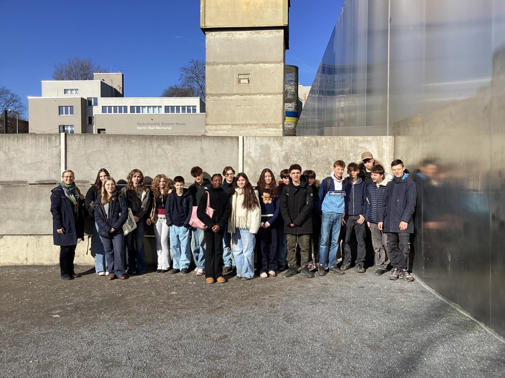 Die französischen Gastschülerinnen und -schüler aus Paris-Antony konnten am 26. Februar 2026 zusammen mit ihren deutschen Austauschpartnern aus den Klasse 9a und 9b einen Eindruck von Berlin zur Zeit des Kalten Krieges bekommen. Bei strahlendem Sonnenschein waren insgesamt 20 Personen auf dem Berliner Mauerstreifen, sie haben die echte Mauer von oben und in der Ausstellung "Alltag in der DDR" im Museum in der Kulturbrauerei in gemischten Gruppen eine Schnitzeljagd gemacht. Zum Abschluss gab es eine echte Berliner Currywurst.