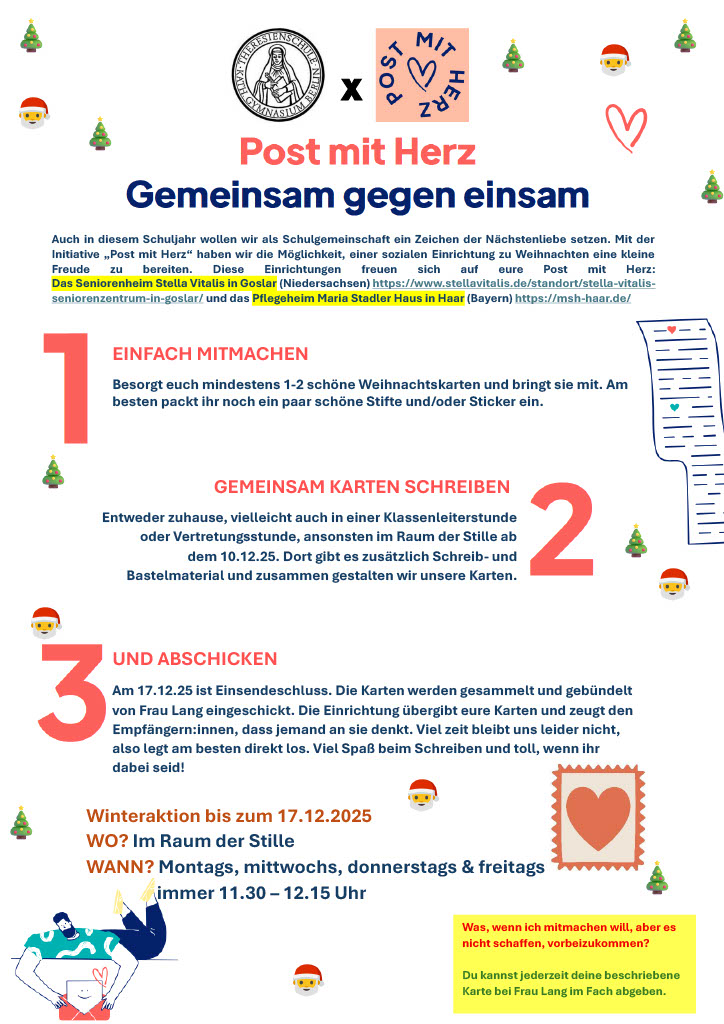 Am Samstag, den 29. März 2025 haben vier Schülerinnen und Schüler unserer Schule an der Deutschen Neurowissenschaftsolympiade am Max-Delbrück-Center in Berlin-Buch teilgenommen. Hierbei handelt es sich um eine Premiere für uns Theresianer, die durch den Referendar Herrn Bunkowski (Chemie/ Biologie) initiiert und von einigen Schülerinnen und Schülern sehr begeistert aufgenommen wurde. Leider konnte sich keiner der Teilnehmer für die zweite Runde in Frankfurt qualifizieren, jedoch wird im kommenden Jahr ein neuer Versuch gestartet und die Abläufe sind dann besser abschätzbar.